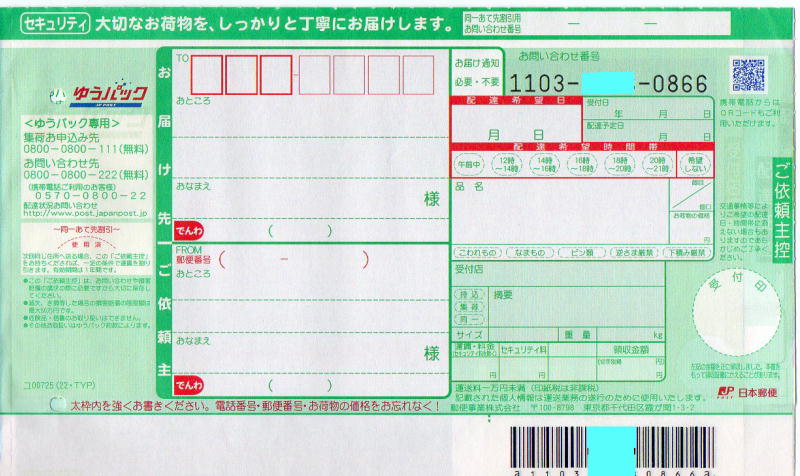 特徴−お届け通知有り。伝票1枚ずつに最初から分かれている。取扱所控えには住所は写らない仕様。