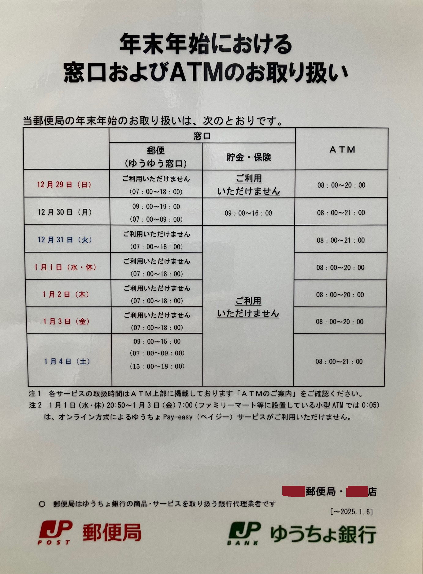 年末年始の郵便局・ゆうちょ銀行ATM稼働状況をご覧ください
