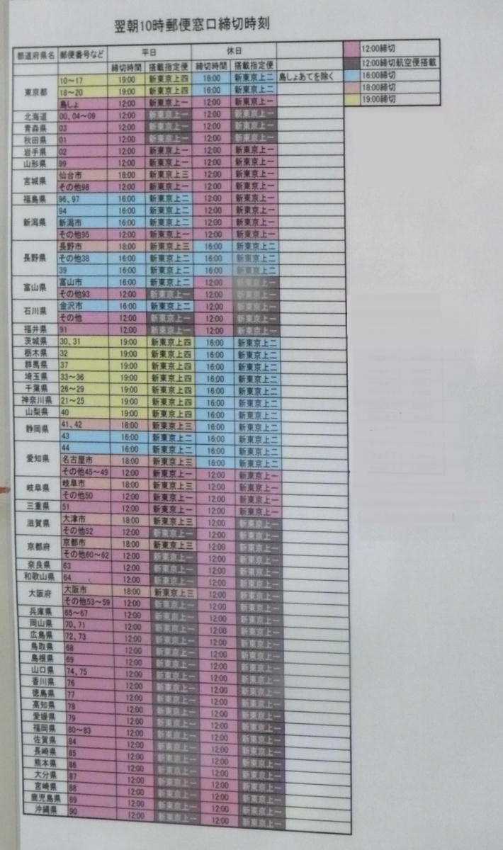 ※締切時刻は郵便局により可能な範囲での設定がされていますので無理な地域にある郵便局は取り扱わない場合があります