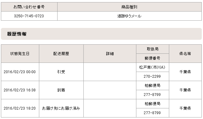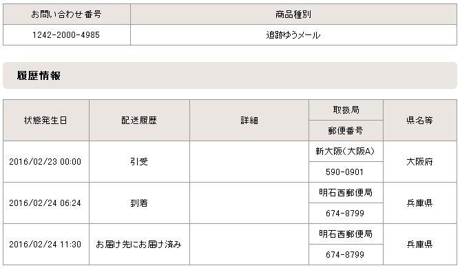 (投函日が最終取集後である場合、投函日の2日後の夕方までに伝票が印刷され「引受」が入ります)