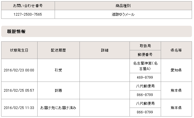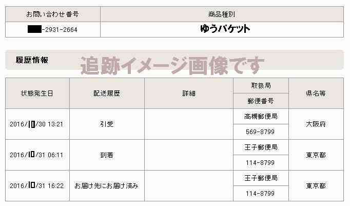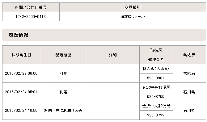 A:追跡ゆうメールですので東京から発送されたら大阪や仙台ぐらいまでが翌日配達です