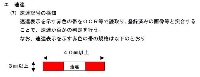 ポストに入れる場合の速達の表示は大事です。定形サイズは選別機械と人の目で速達の特徴を探して