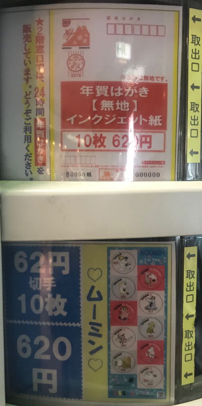 その時間外窓口が夜に閉まってからも来局した切手やはがきの購入者向けに「切手・はがき自動販売機」が設置されていました。
