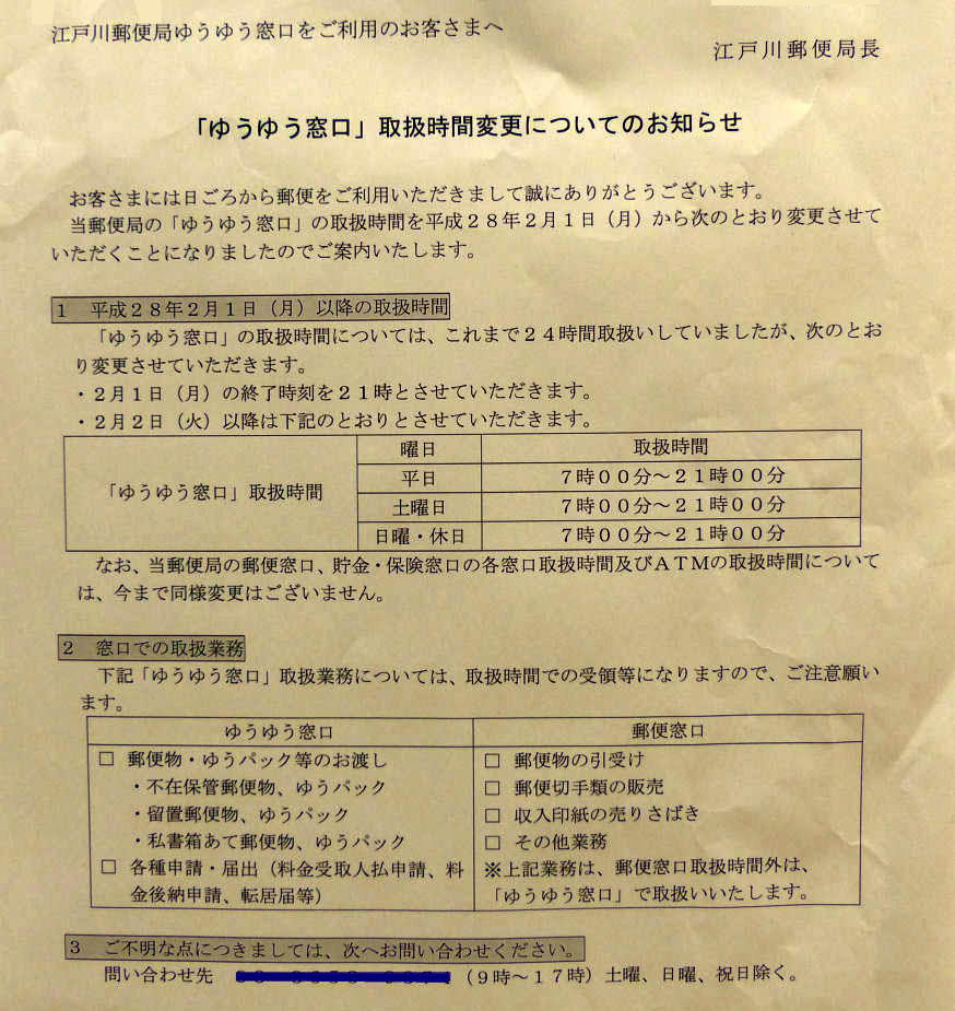 江戸川郵便局132-8799ゆうゆう窓口営業時間短縮のお知らせ(24時間開設廃止)