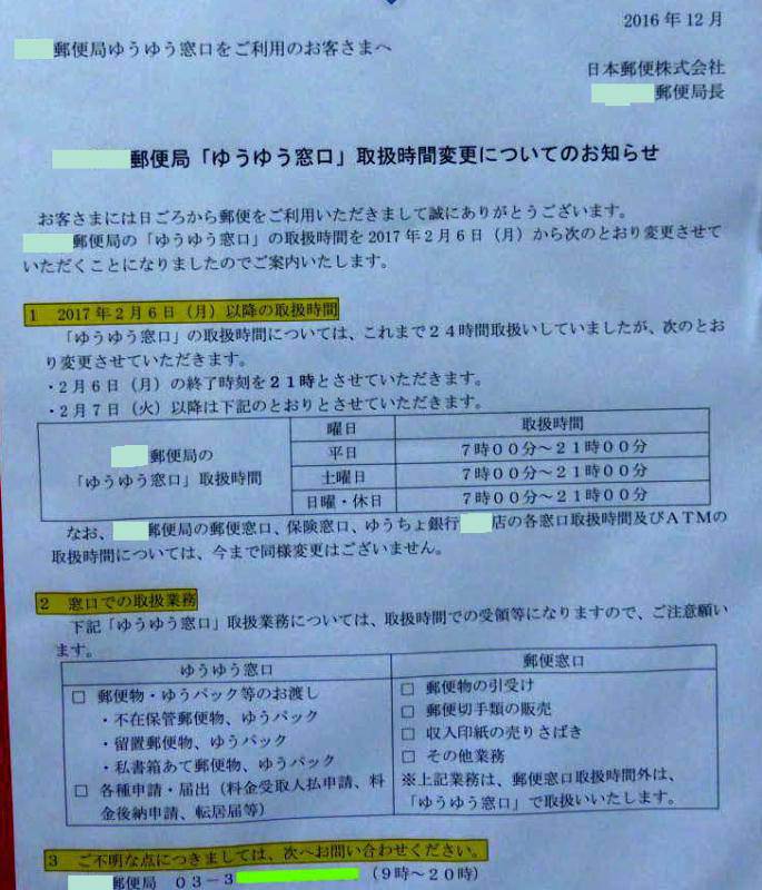 2016年2月より東京にある郵便局でも24時間営業をやめる局では廃止の発表告知がされました。