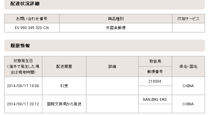 日本のサイトで見ると「09/17 19:08引受」「09/17 20:12国際交換局から発送」で終わっている(2014/12調査)