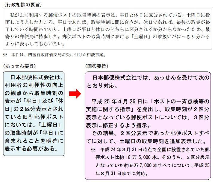 改善結果:郵便局に対し、改善を依頼したところ、郵便ポストに収集時刻等が表示された。