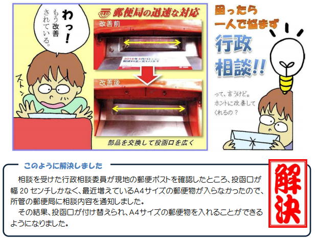 所管の郵便局に相談内容を通知しました。その結果、投函口が付け替えられ、A4サイズの郵便物を