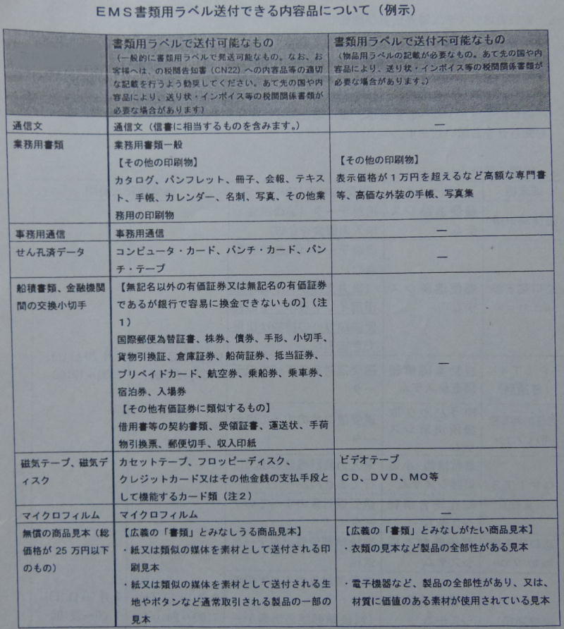 国際郵便の「書状」(主に封書で送付される国際郵便物)は、「書類」のみ包有と定められ、